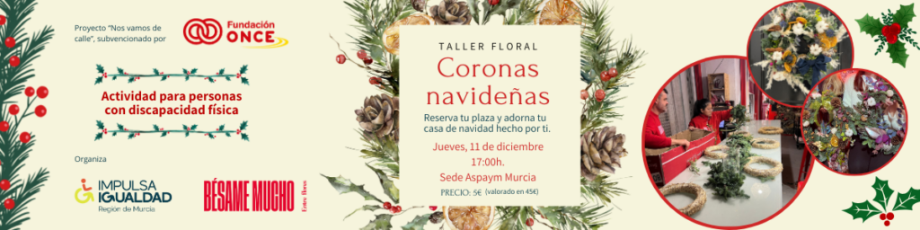 El jueves 11 de diciembre, Impulsa Igualdad Murcia, junto a Bésame Mucho, celebrará un Taller Floral Navideño en la sede de ASPAYM Murcia, ofreciendo a personas con discapacidad física la oportunidad de crear su propia corona navideña y disfrutar de una tarde de creatividad y ocio inclusivo.