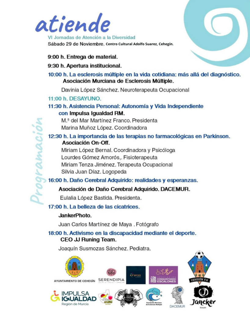 El próximo sábado 29 de noviembre, Impulsa Igualdad Murcia estará presente en las VI Jornadas de Atención a la Diversidad Funcional, organizadas por Atiende19 y Serendipia Terapias y Formación, ofreciendo la ponencia “Asistencia personal: autonomía y vida independiente” dirigida a profesionales sanitarios, personas con discapacidad, familias y público interesado en el sector.